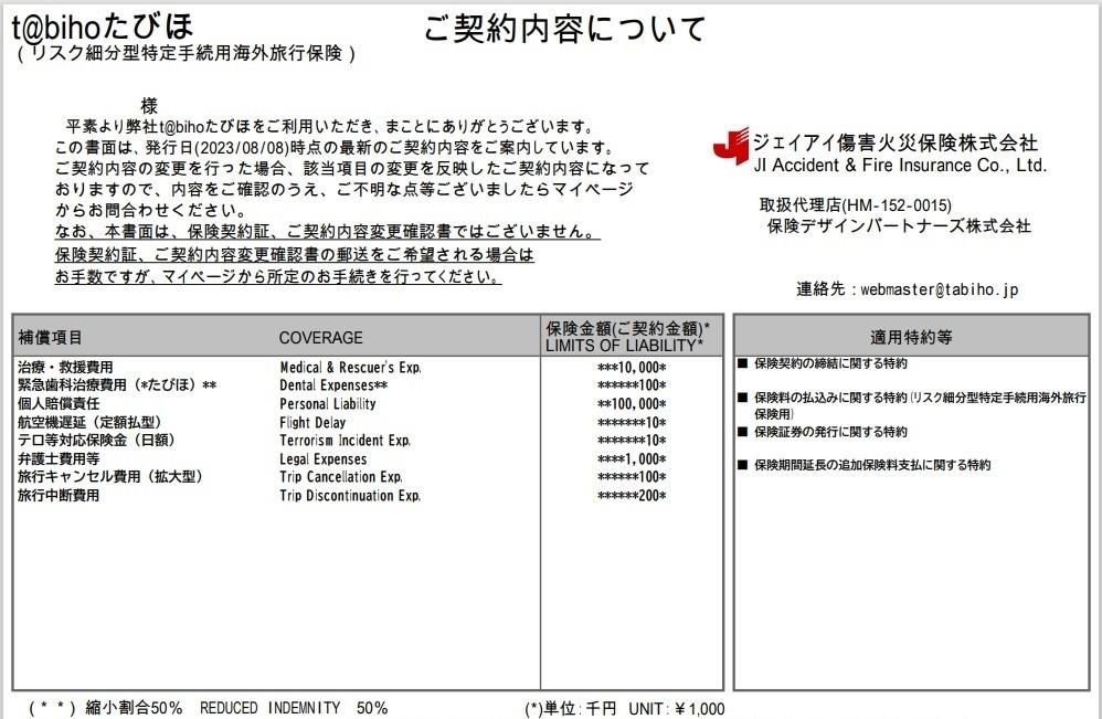 久々の海外だし、しかもコロナ後初なので、キャンセル補償が充実した海外旅行保険「t@biho」の商品を購入してみました。 お守りとして・・・