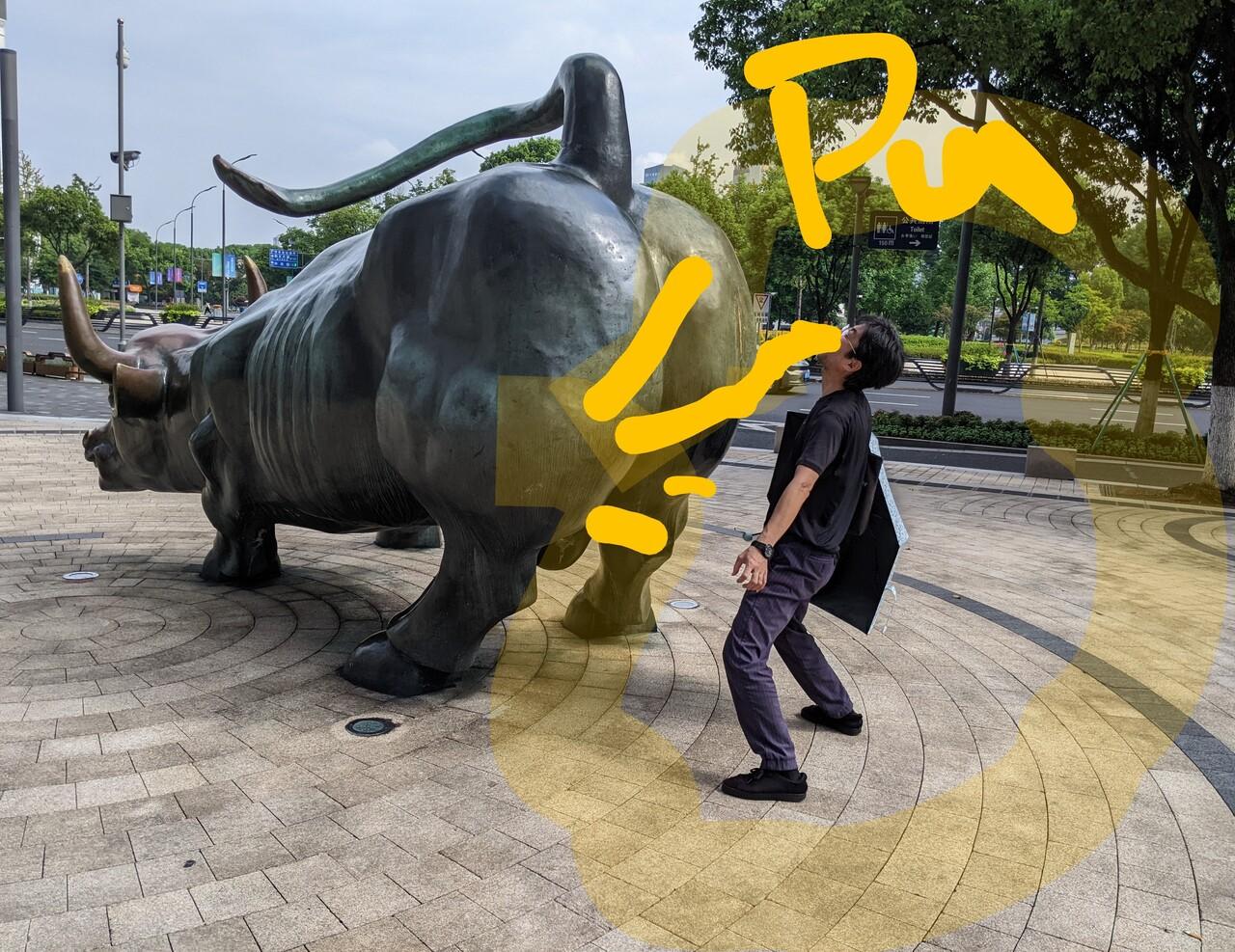 少し歩くと地下鉄の天一広場駅前に巨大な牛!