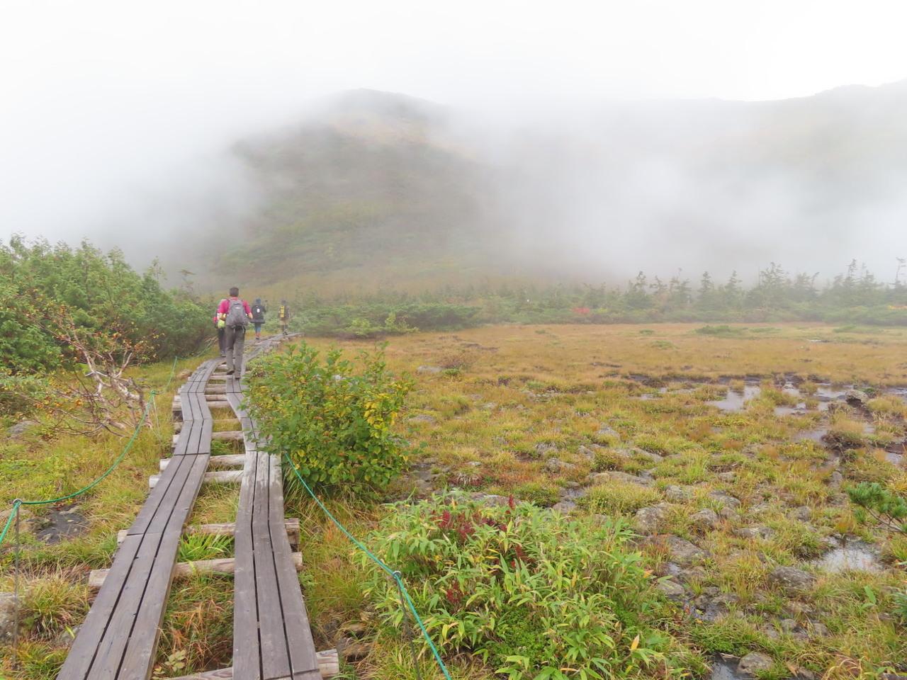 木道の天狗原に到着、雨やん。山の天気予報、曇なのに。