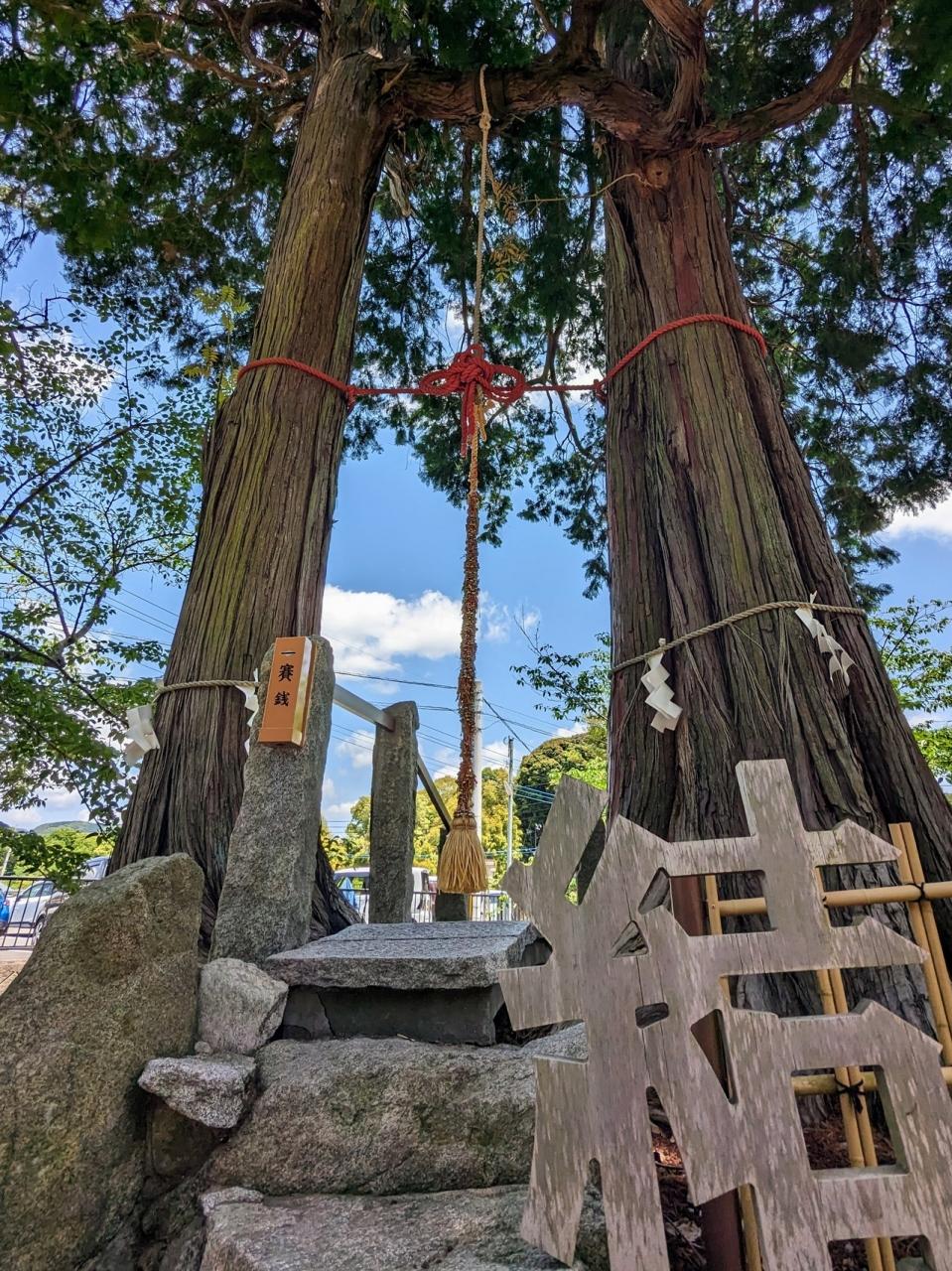 色々な縁結びの象徴として信仰される夫婦檜だという。根っこも枝も結ばれていて仲良し。