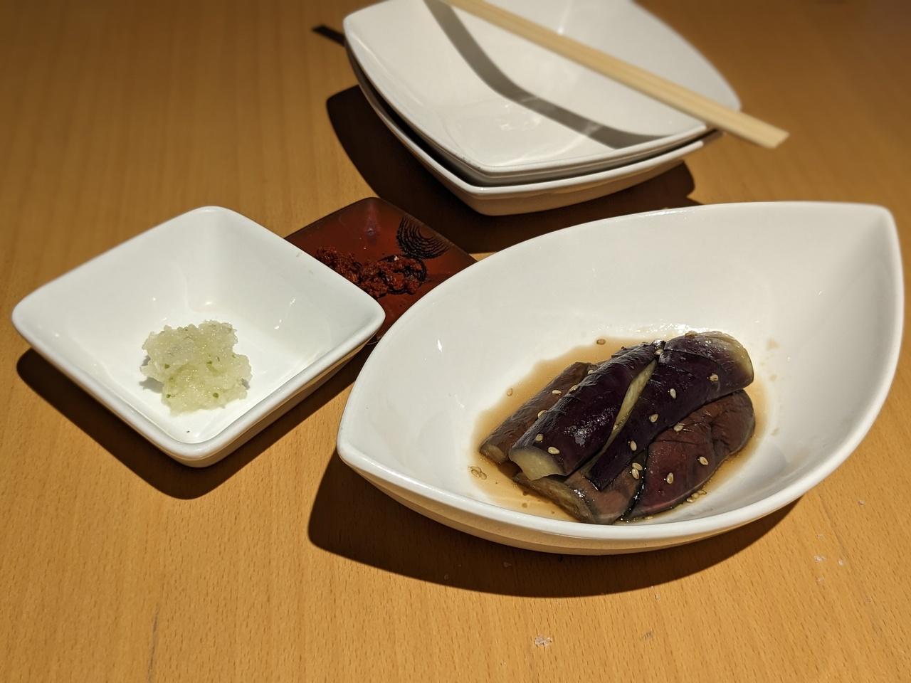 セイロ蒸しの付け合せにナスのナムル。お肉でこれを巻く食し方もオススメされた。