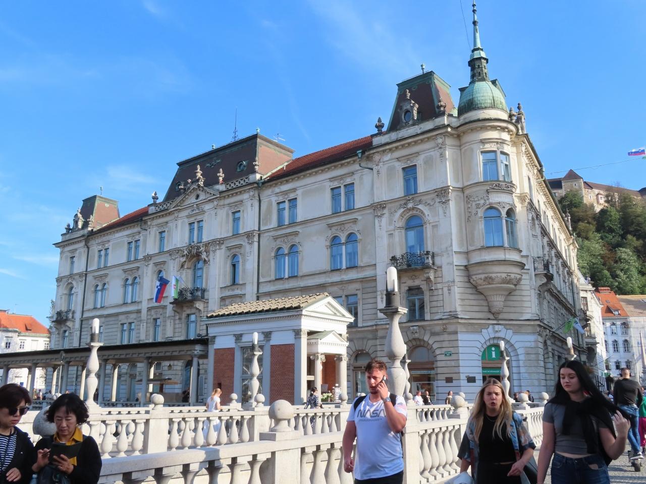 広場の中央でガイドさんの解説を聴きつつ、周囲を見回します。「三本橋」の向こうには観光案内所などいろいろ入っている歴史的建造物。後方に「リュブリャナ城」、のぼれないのが残念です。