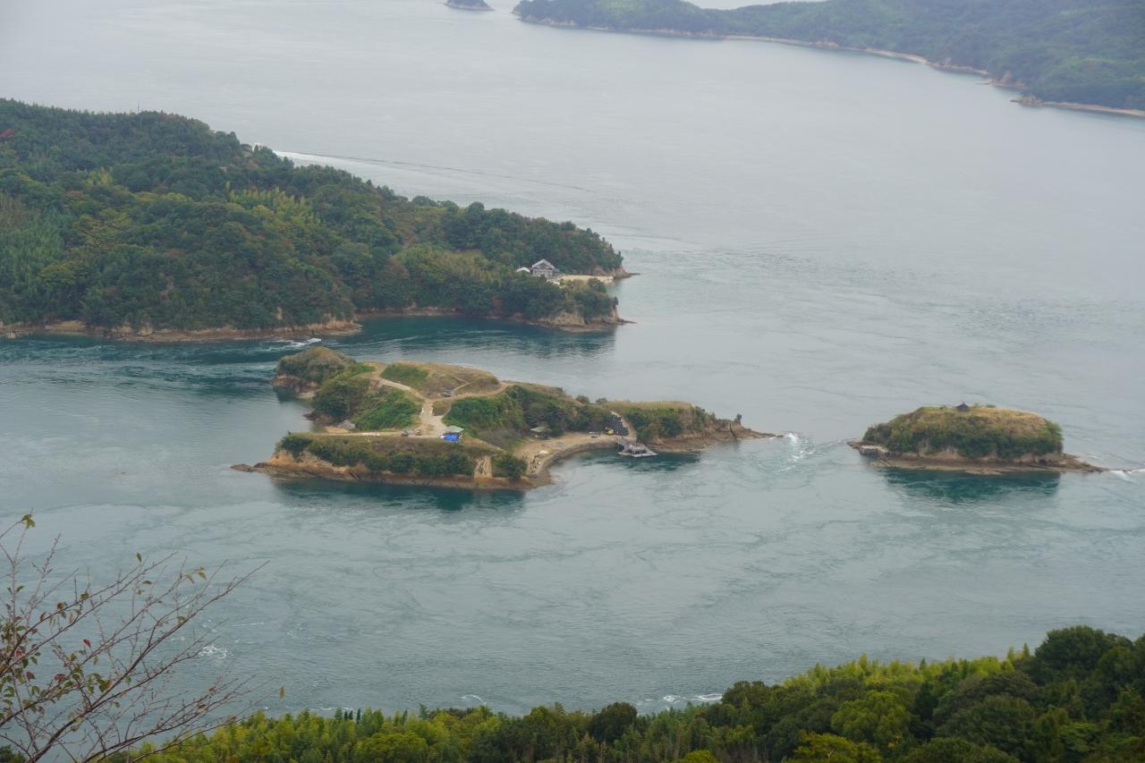 鵜島の南側に豆粒のような能島 鯛崎島が連なっている姿。能島 鯛崎島の辺りも船折瀬戸に負けないくらいに潮が速い。島と島の細い部分はいつも白くさざ波だっていて、ちょっと迫力ある光景です。