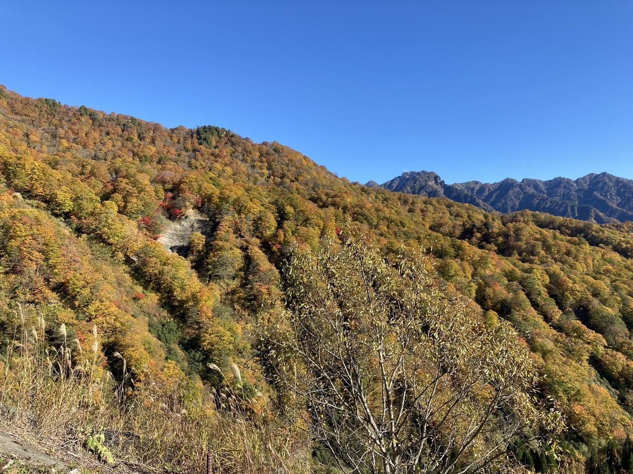 黄金色のブナの森と高妻山が綺麗。 -