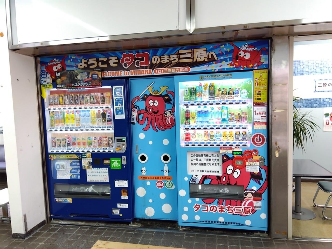 待合室の自販機も、タコ!三原港 乗り物