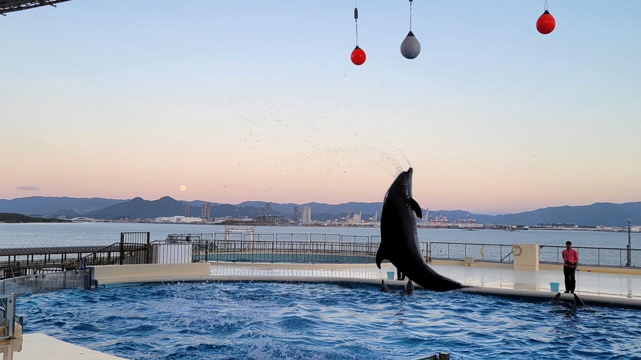 海沿いのプールでイルカショーが見れました。ちょうど夕日が沈んできました。遠くに月も出ています。