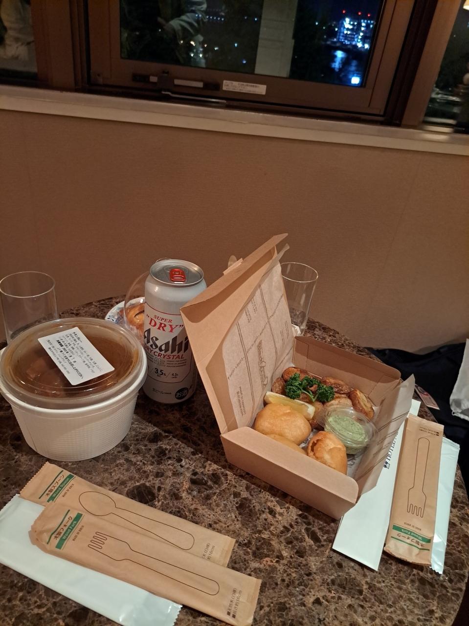 窓外のガンダムファクトリーとベイブリッジの夜景。