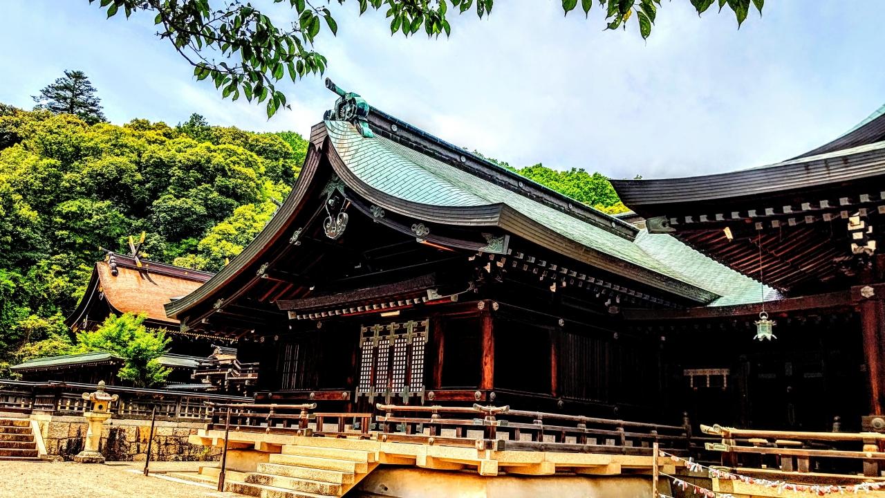 入口から見ると、青々とした木々の間から吉備津神社の社殿が見える。吉備津神社の社殿は室町時代に再建されたもので、拝殿は2棟を1棟に連結させた比翼入母屋造になっている。桃太郎のモデルになっている大吉備津彦大神を主祭神とする神社だ。