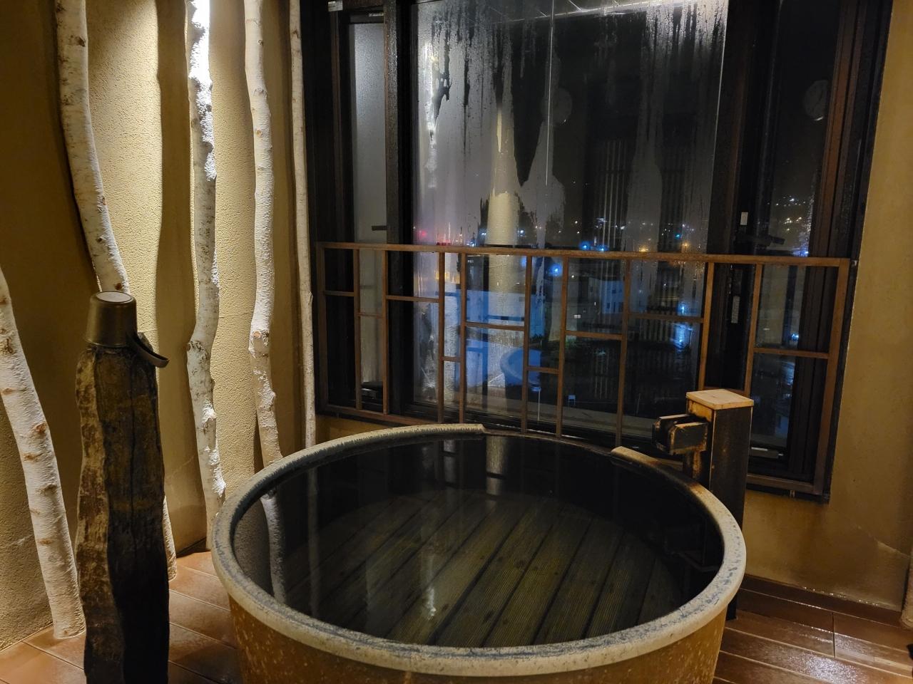 夜は展望ゼロですが明るいと景色がばっちりの樽風呂があります。