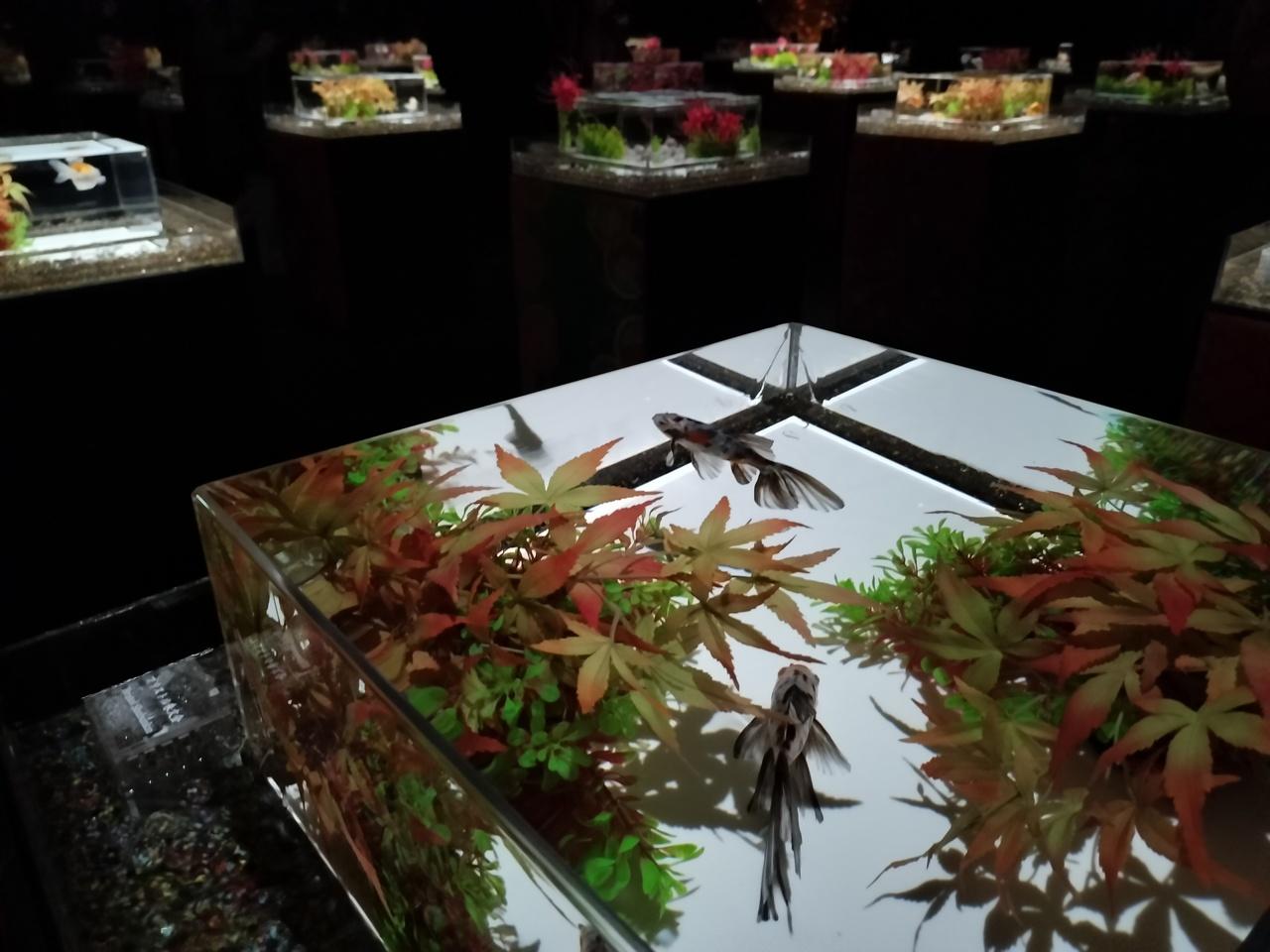 光の演出の中を、優雅に泳ぐ金魚たち。