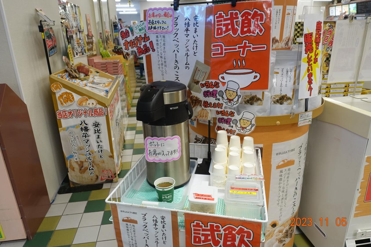 売店ではブラックペッパー入りのマイタケ、マッシュルームスープ試飲があったので飲んで見ました。胡椒のきいたコクのあるキノコスープで濃厚なラーメンの汁によく合いそうな美味しいスープでした。