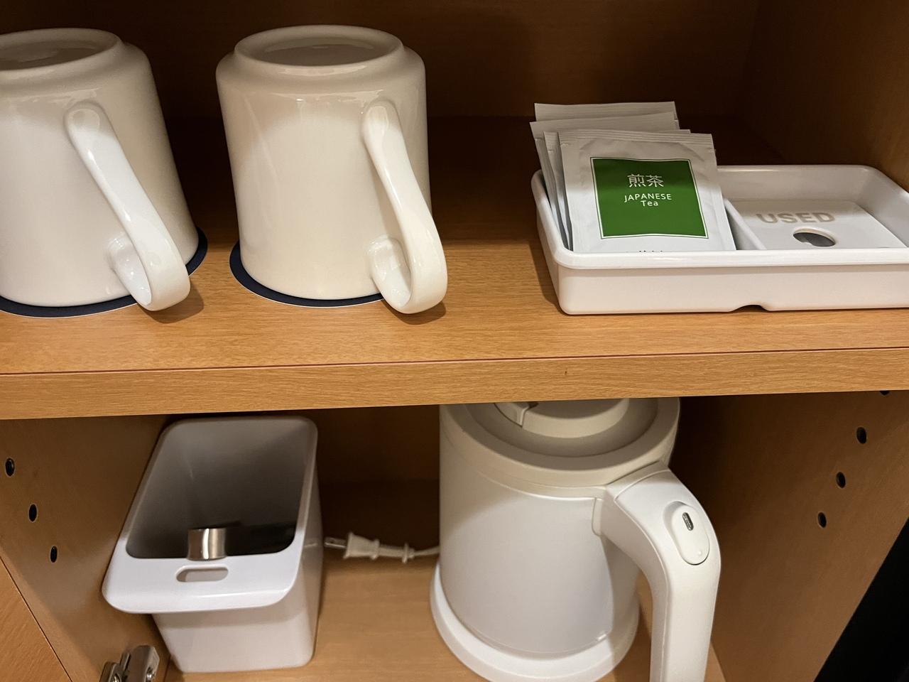 マグカップ、電気ポット。ほうじ茶、お茶ティーパック2つずつ。