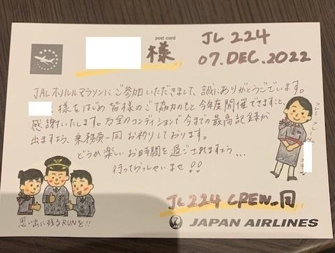 JL224便、羽田空港で降機時にCAの皆さんから励ましの言葉をかけていただき、とても良い気持ちになったので、絵はがきは今も大切に記念品として持っています。
