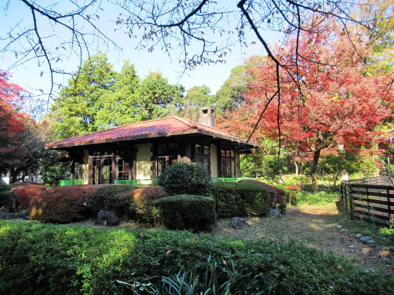 写真は、旧渋沢庭園にある、紅葉に囲まれた「晩香廬」。