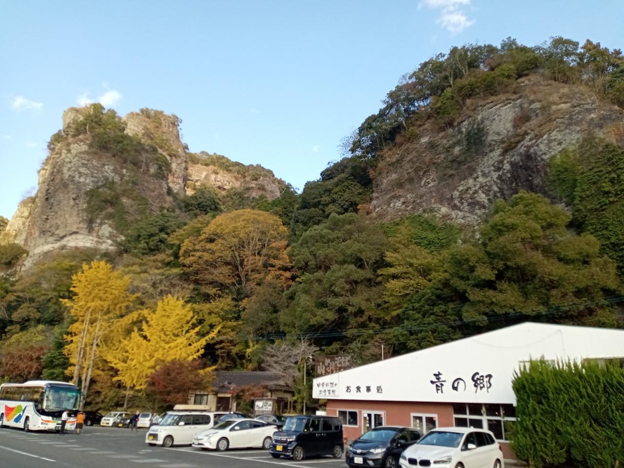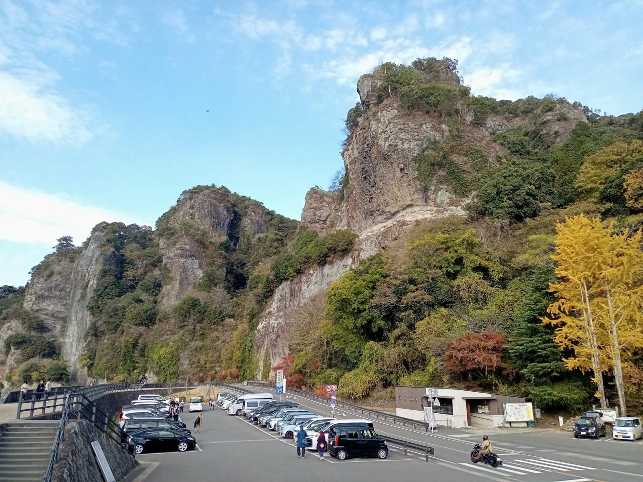 耶馬渓のメイン青の洞門を潜り抜けます。手前のイチョウが綺麗でした。そして洞門を抜けると巨大な奇岩、競秀峰が現れます。13時半頃、青の洞門&競秀峰の無料駐車場に到着です。少々駐車場待ちがありました。