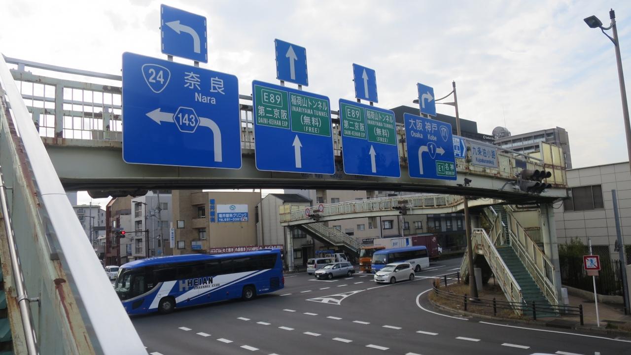 東大路通の東福寺交差点から駅前の通り「伏見街道」(本町通)まで戻って「九条跨線橋」沿いに「九条通」スタート