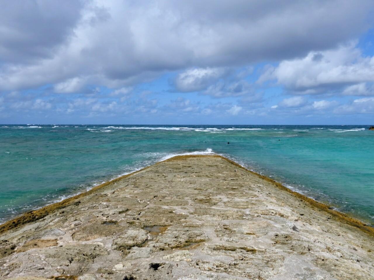 外洋は波が高いけど、外洋に向かって伸びる展望所が波を打ち消しているのでビーチは波が小さいです。