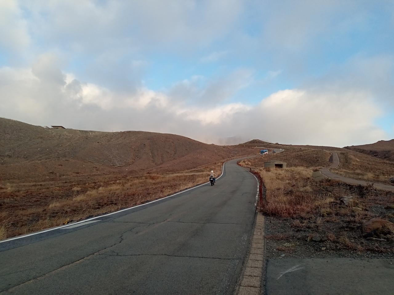 16時半過ぎ、阿蘇中岳火口駐車場に到着です。噴煙が混ざっていて、幻想的な風景になっています。関東ではもう暗くなっている時間帯ですが、九州ではまだ明るい時間帯なので良かったです。