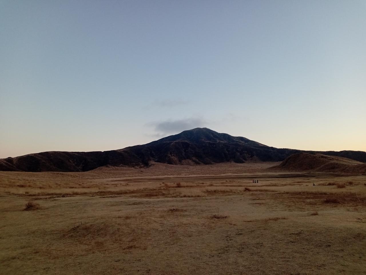 草千里ヶ浜に戻った所で駐車場に停めて、日没後の草千里ヶ浜を散策します。駐車場からの眺めでも、草原と烏帽子岳の光景が絶句するほど美しいです!