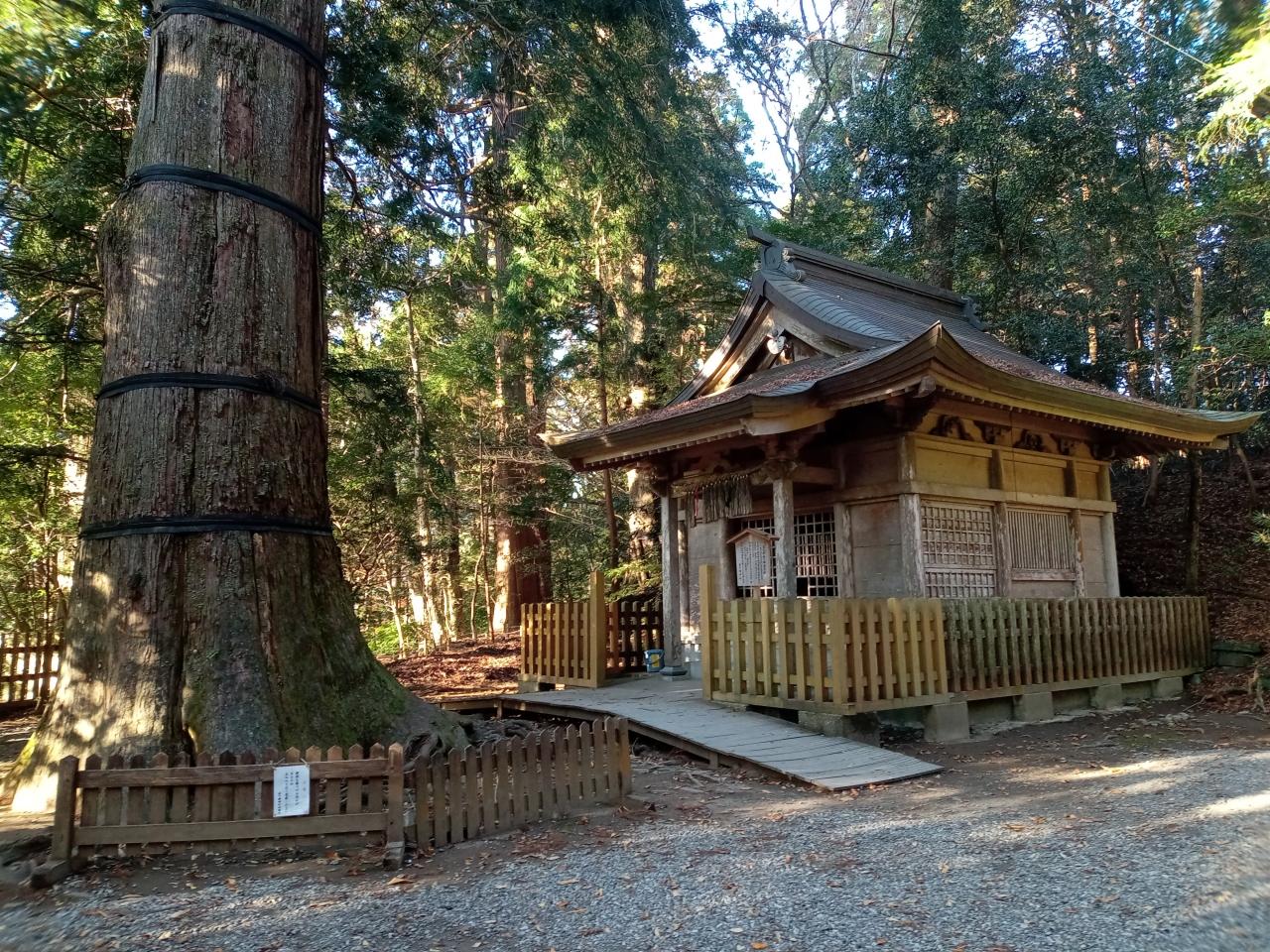 実に景観が素晴らしい寺社と特定の杉の木の幹ですね!