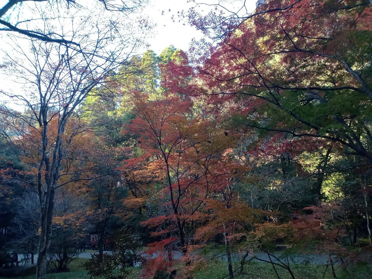 一部赤いピーク状態の紅葉が見られますね。駐車場から見えるいくつかの寺社の家並みとバックの杉並木の景観が素晴らしいです。