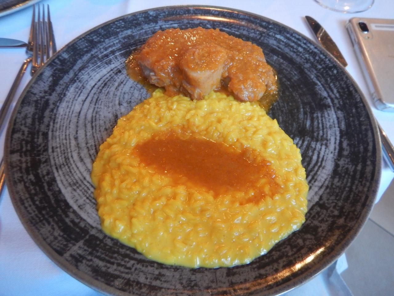 イタリア最後の夕食は、ミラノ風リゾット(サフランリゾット)を『IL Carpaccio Milano』で頂きました。ミラノ風ドリアにオッソ・ブーコ(子牛のスネ肉)が付いてきます。食べ応え十分です。一生懸命食べて何とか完食しました。ドリアは好き嫌いが出る個性的な味、オッソ・ブーコはとても美味しかったです。