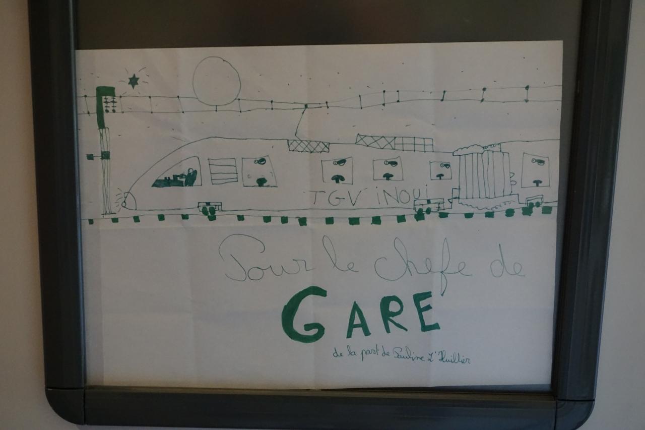 隣の車両がBar車両(軽食ビュッフェ)で、発車前から昼食を求めるお客さんで行列ができていました。Bar車両の壁面に、子供のかわいい絵が飾られていました。
