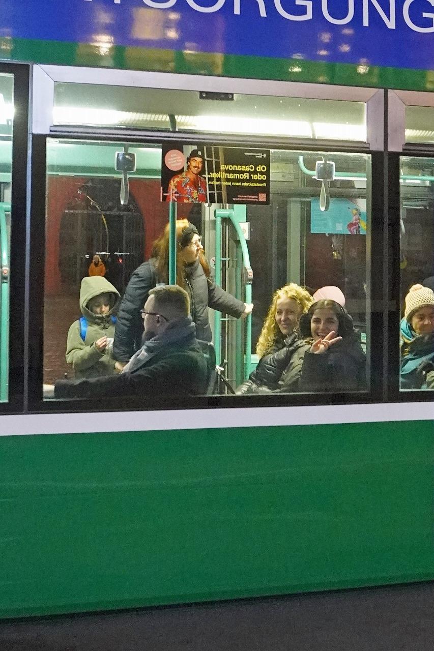 市庁舎の全景を写真に撮ろうと待っていますがトラムが行き交ってなかなか写真を撮ることができませんでした。やってきたトラムの中に高校生くらいの女の子がいて、カメラを指さして写真を撮ってというようなゼスチャーをしているのに気が付きました。カメラを棟ると友人と一緒にこちらに笑顔を送ってくれました。出発するトラムに手を振ると笑顔で手を振ってくれました。たわいない交流ですが、寒いスイスの夜に心温まる気がしました。