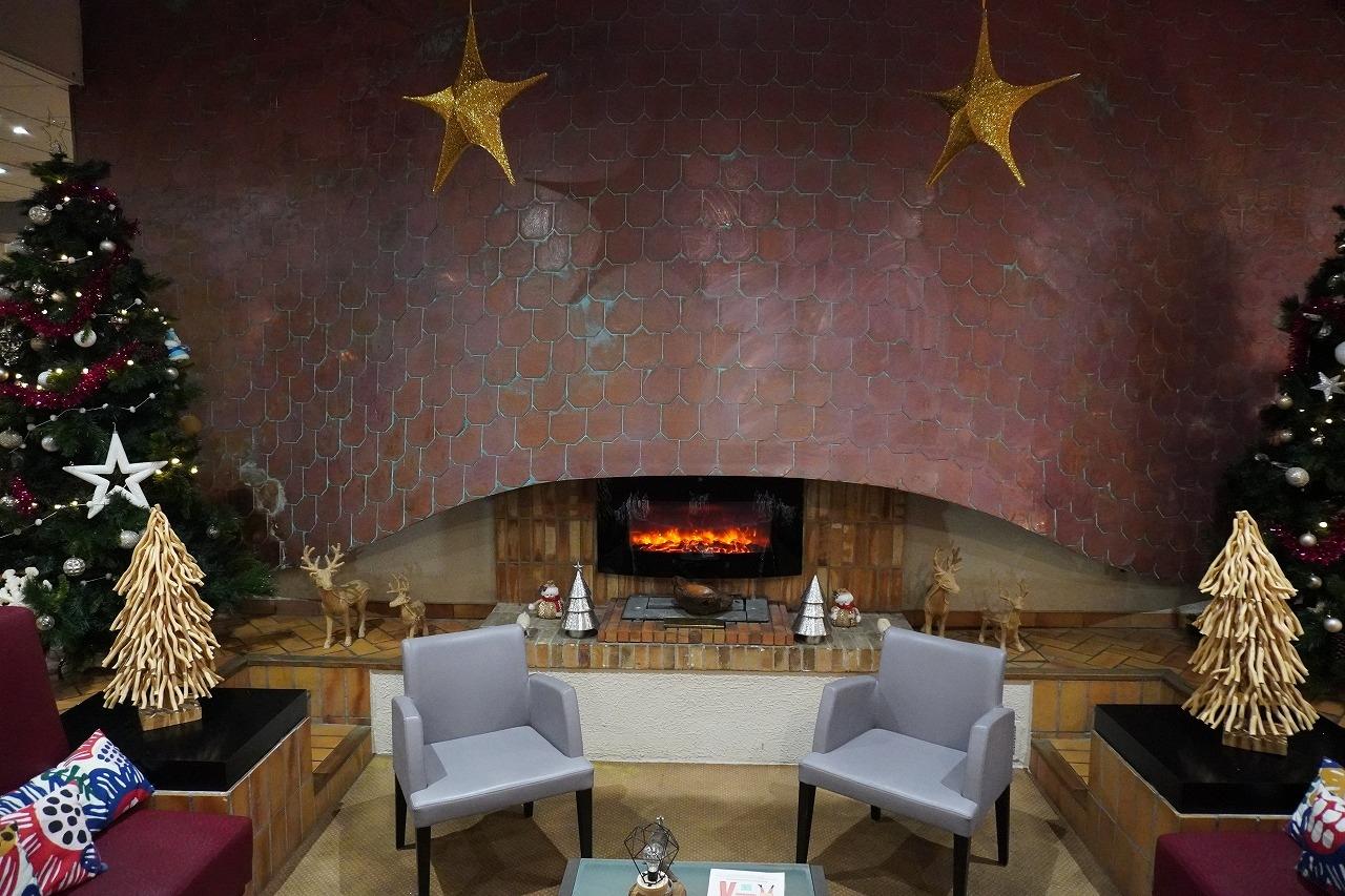 中庭は夜間でも解放されていて、壁にはプロジェクションマッピングで楽しいクリスマスの情景が移されているので人気があるようです。手前に建つクリスマスツリーが半分しか点燈していません。