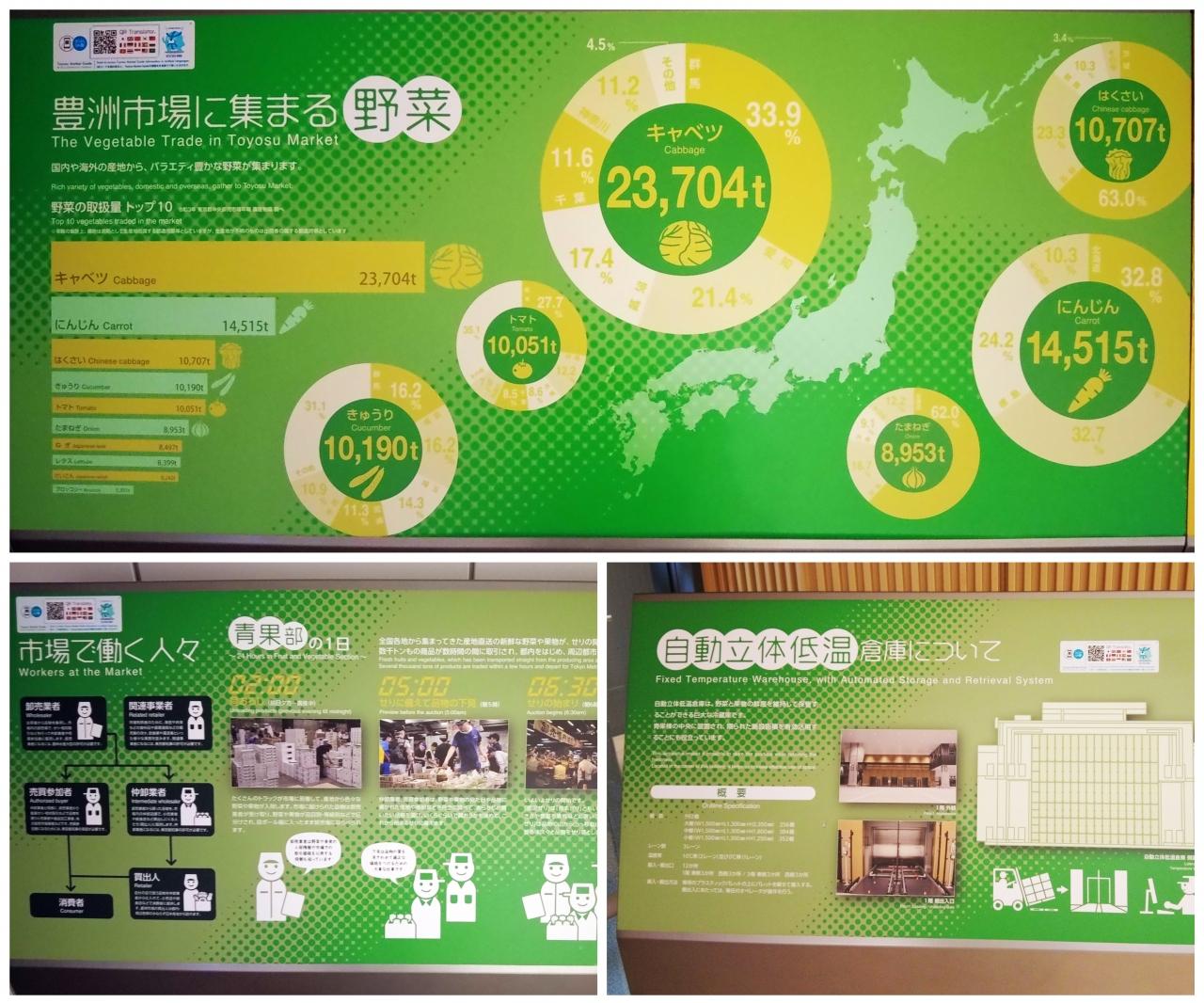 また建物内の長い通路を歩いていきます。途中、青果棟に関するパネルがたくさんありますが、こちらのパネルの色は野菜なんかを扱うので緑色に統一されています。