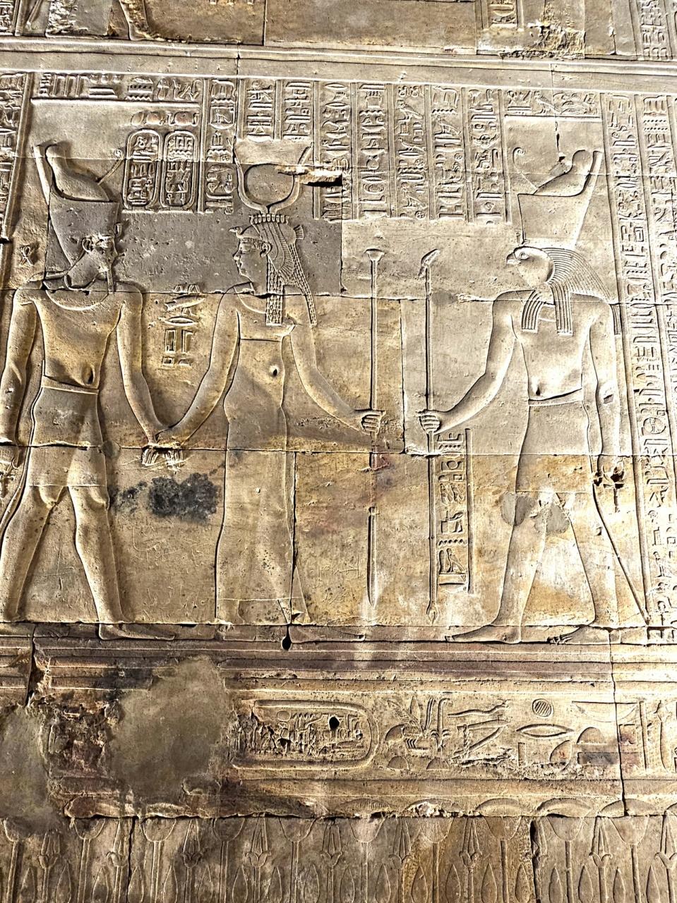 左右対称のレリーフのようで、右から母のイシス女神、中央にホルス神、左にプトレマイオス12世。