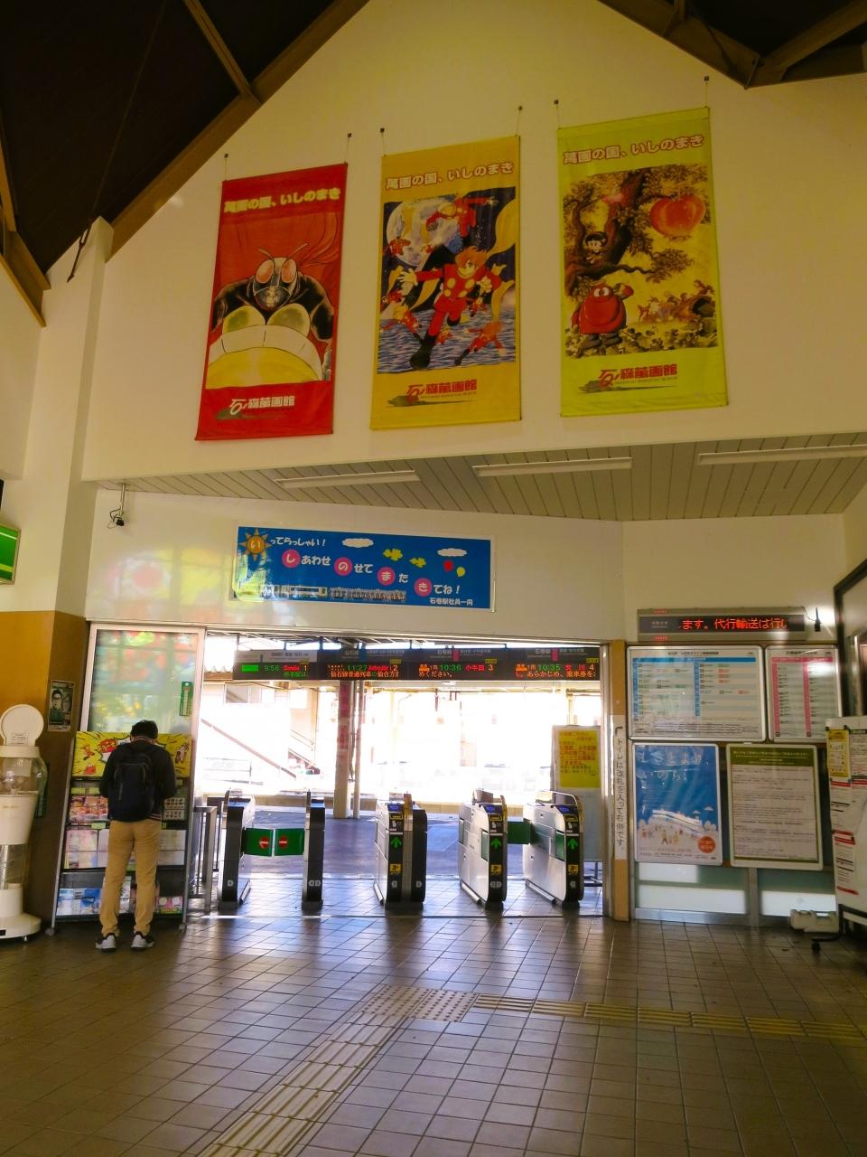 石巻市は石ノ森章太郎氏(サイボーグ009や仮面ライダーの原作者)の協力を得て「マンガの町」として町おこしをしました。駅前から石ノ森萬画館までの約1kn「石巻マンガロード」には石ノ森章太郎作品に登場したキャラクターのモニュメントが数多く設置してあります。※石ノ森章太郎氏は石巻市の隣り登米市(とめし)出身です。 -