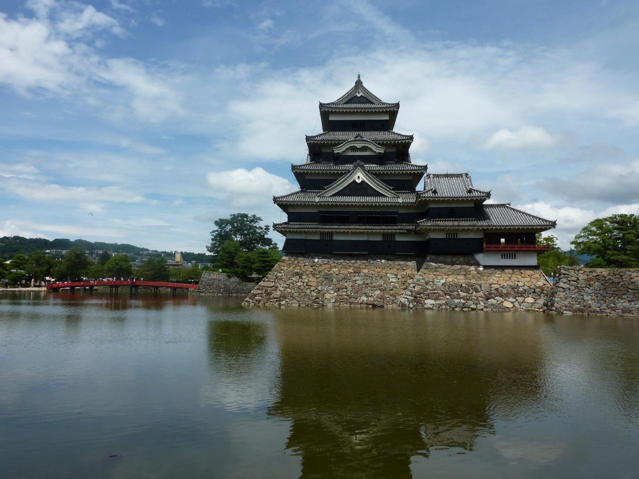 五層の天守閣を持つ城で、現存するものは姫路城と松本城のみです。徳川家康から出奔し秀吉に仕えた石川数正が、豊臣家の忠誠を示す為、漆喰塗の上に防火用の黒漆を塗り、白と黒の独特のカラーリングとなったと言う説があります。