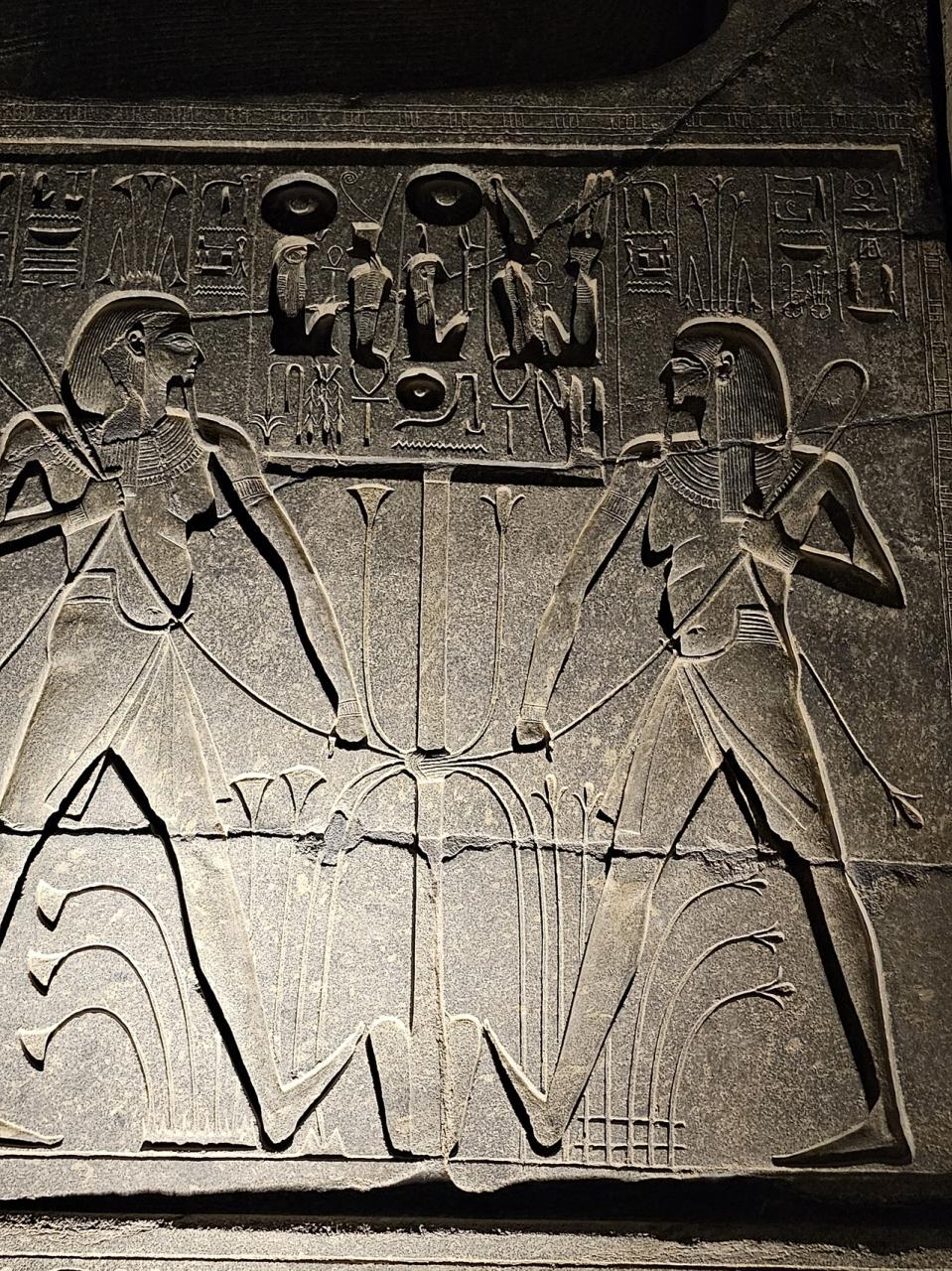 両性具有の神ハピ神。上エジプトの象徴ロータスと下エジプトの象徴パピルスをハピが結ぶことにより上下統一の意匠(セマタウイ)の王であるラムセス2世、そのロイヤルカァが玉座に彫られている。 -