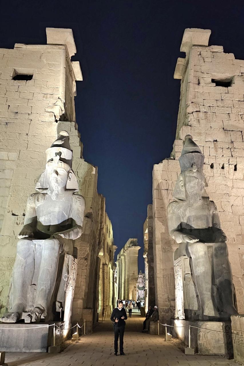 さすが古都テーベことルクソール、ナイル川西岸の王家の谷にとどまらず、東岸も見どころ満載。内容は知らずともカルナック神殿やルクソール神殿の名は知っていますよね。午前の王家の谷の墓巡りから昼下がりは神殿散歩、夜は音と光のショーと目いっぱい観光の一日でした。
