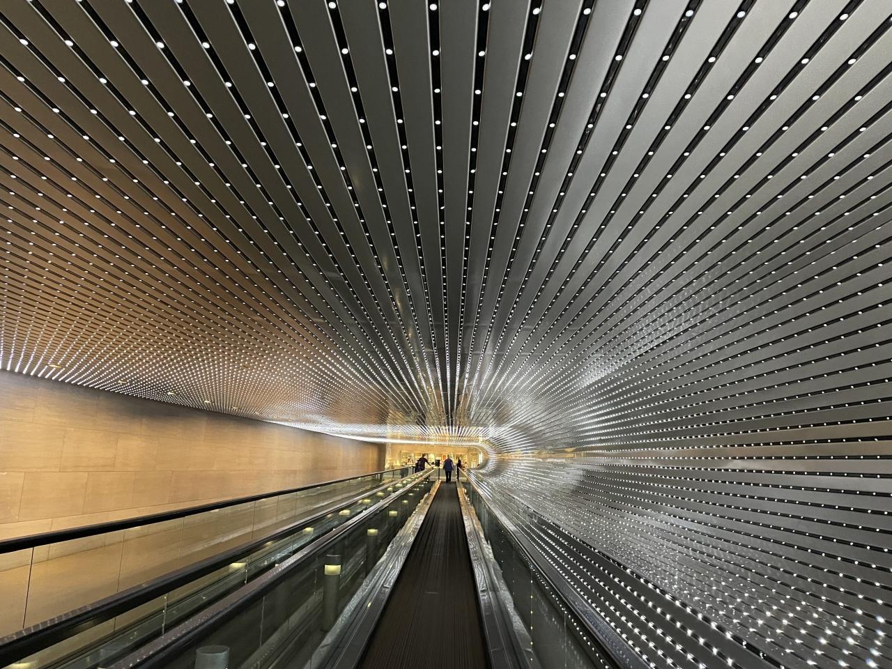 本館の西館からは地下の通路で繋がっています。この動く歩道で移動。照明がキラキラしていて未来にタイムスリップしていく感じです。