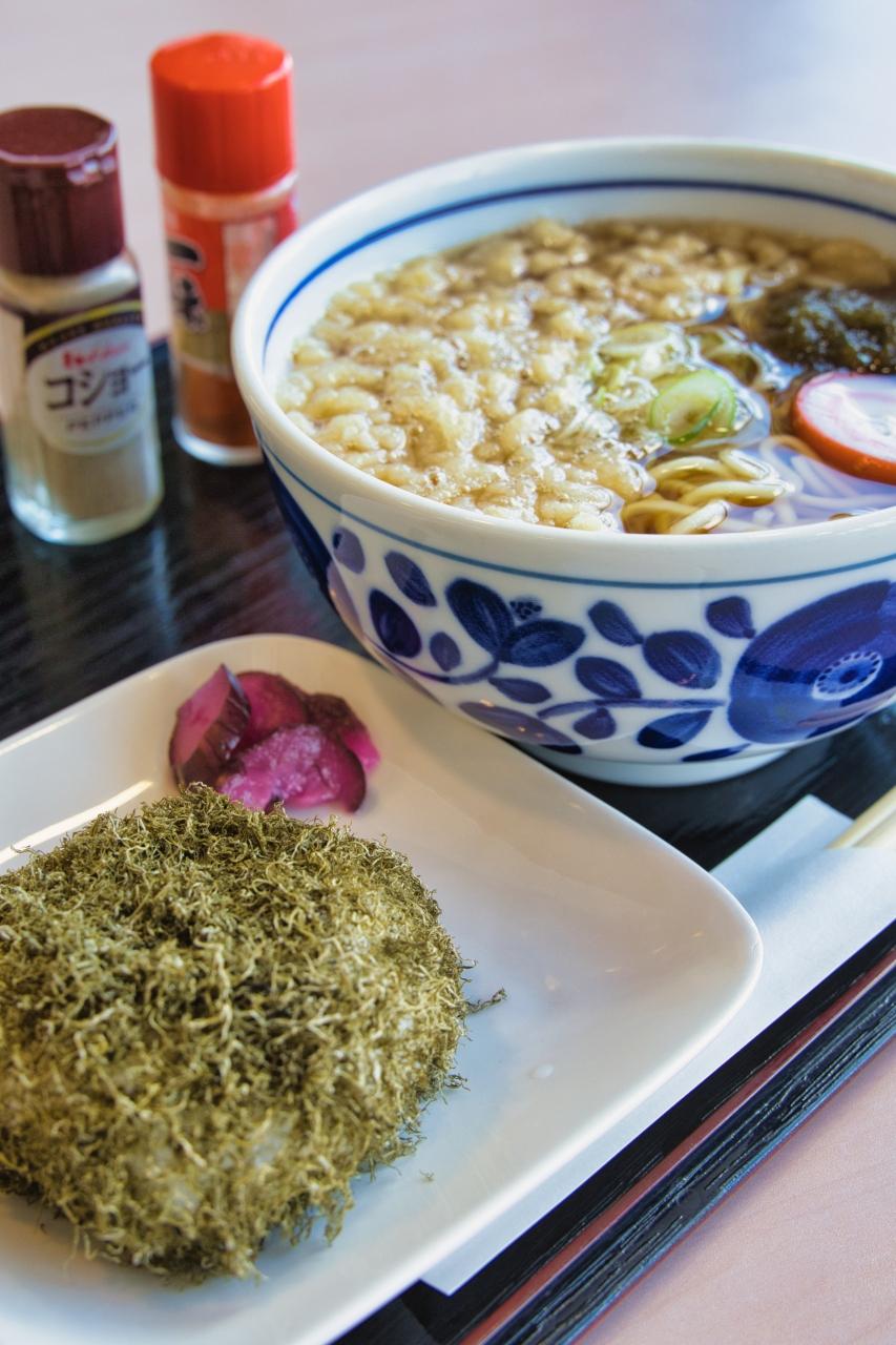 「川の駅」の食堂は空いていましたので、早めの昼食を頂きます。新湊のローカルフード「かけ中」と「とろろ昆布のおにぎり」付きのランチセットを注文。「かけ中」は、うどんの出汁に中華麺ととても不思議な組み合わせの麺料理。とろろ昆布と赤巻きかまぼこが乗っているのが富山らしい。