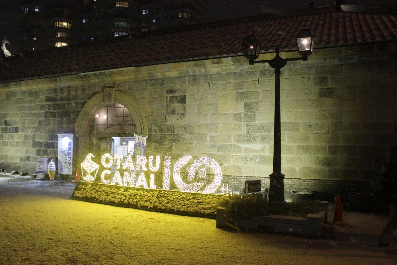 ライトアップしている看板前ではしゃいでいる日本語を話さない男子3人組がとても楽しそうで私も雪景色になっていく街を見ながら同じような気持ちになっていました。小樽市観光物産プラザ(運河プラザ) 名所・史跡