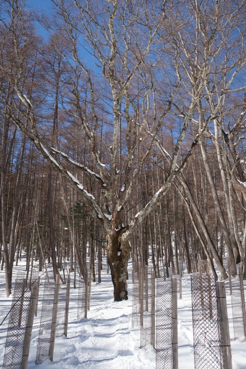 小田代原を通り過ぎ、車道歩きを続けます。吹雪の時とか、シェルターになりそうなうろがある木を発見しました(笑)