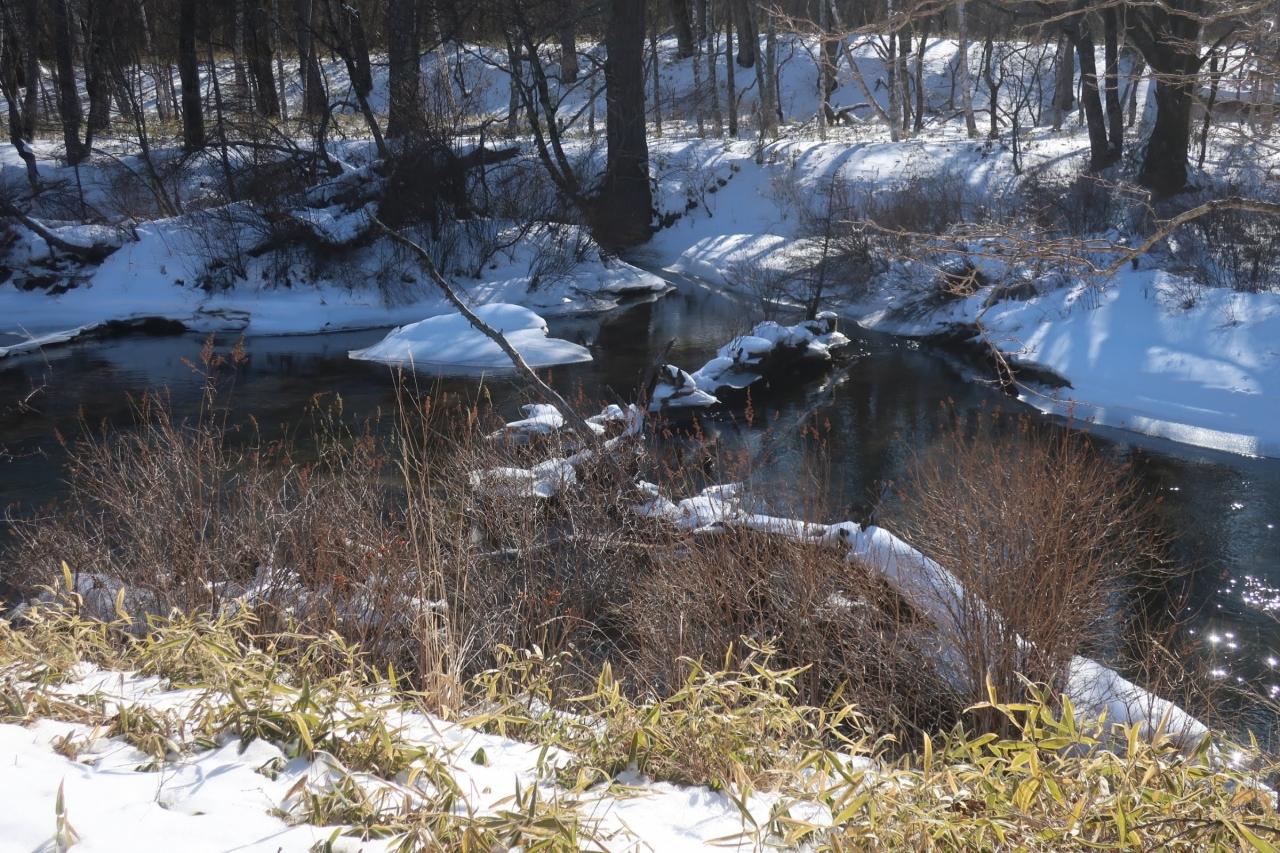 湯川が見えてきました。川の方にはこんもりと雪が積もっている場所も。
