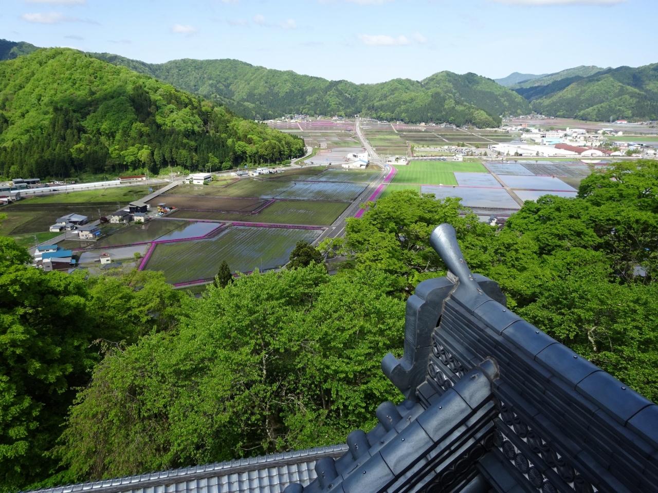 お城の上から見えた田んぼの淵のピンク色