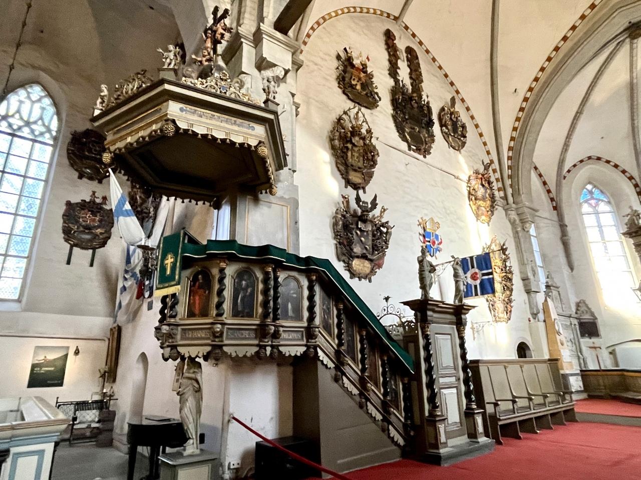 教会内は薄暗く、古色蒼然とした空気に包まれています。何故かというと、教会であると同時に大規模な ”墓所” なのだそう。壁に掛けられた無数の墓碑銘や紋章、墓標や石棺、また教会の床に残る墓石などがそれを物語っています。
