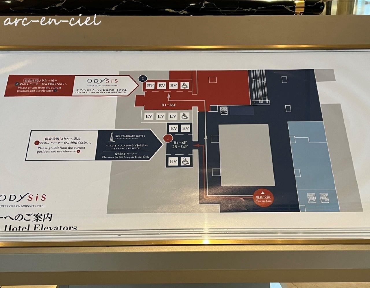 この「SiSりんくうタワー」には、すでにオープン当初に開業している「SiSスターゲイトホテル(フロント1階、客室29~50階)」と、2023年2月に開業したばかりの「オディシススイーツ大阪エアポートホテル」(赤枠)の2つがあります。