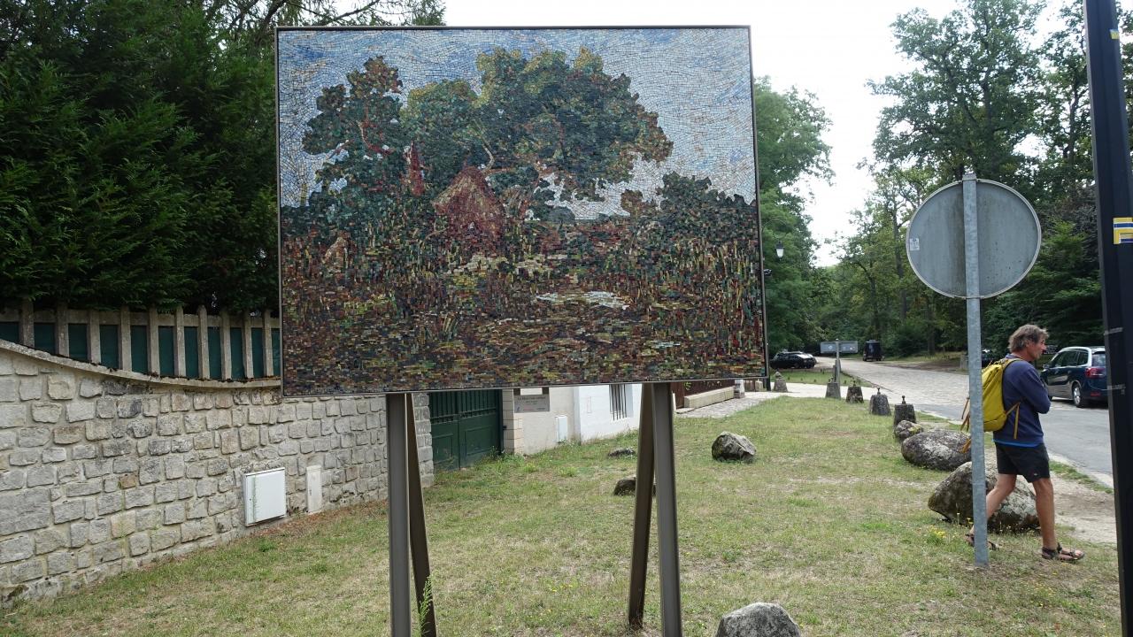 ・バルビゾンは広いフォンテーヌブローの森の端にある小さな農村。ミレーやルソーといったバルビゾン派の画家たちが、ここで生活しながら風景や働く農民たちを描いた。その風景は今でも残っており、彼らが描いた作品がモザイクの形あちこちにで掲げられていた。村歩きはさながら野外美術館の中を歩いているよう。