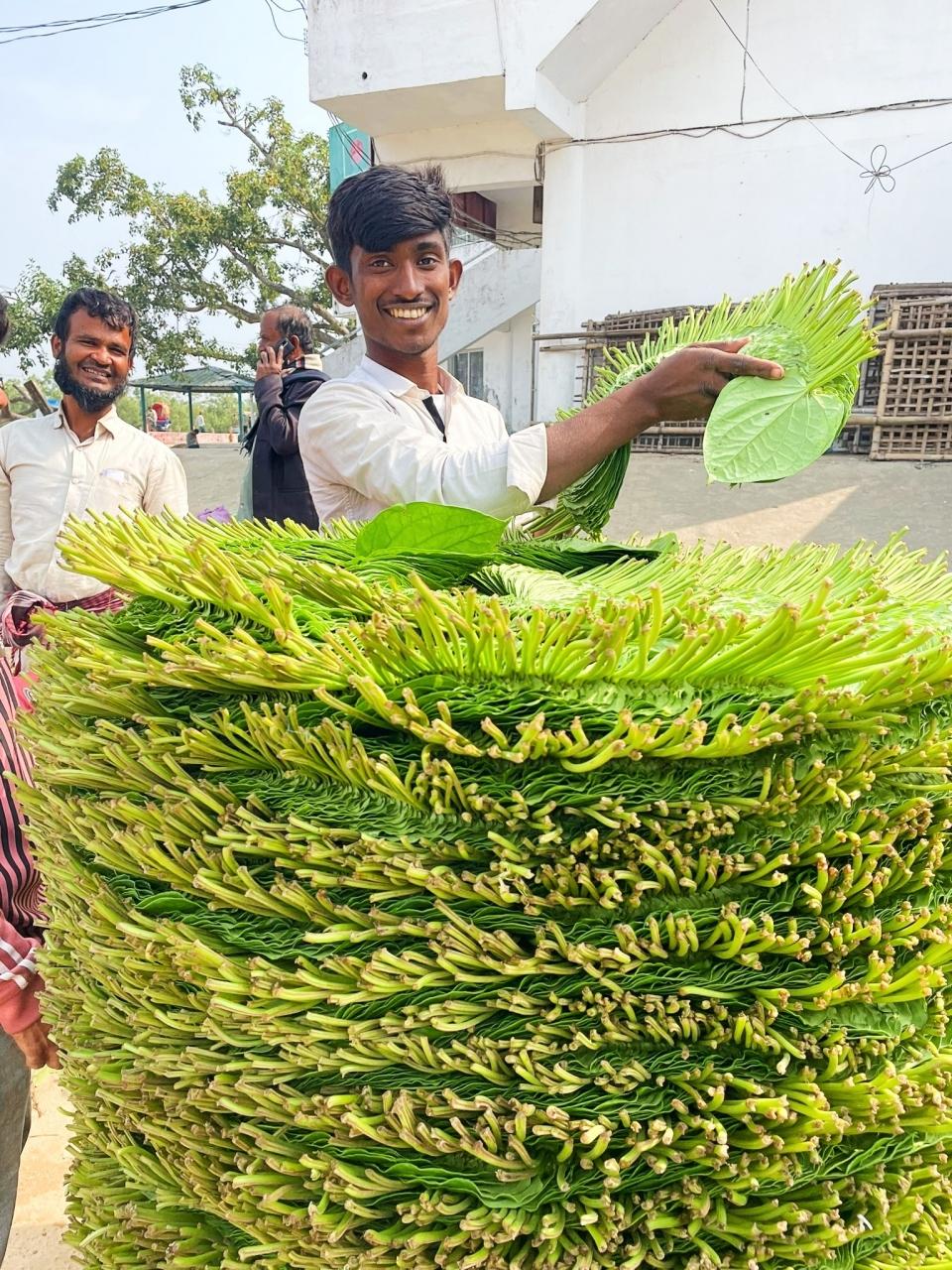 小舟から籠に積み替えられて、市場へと人力で運ばれます。