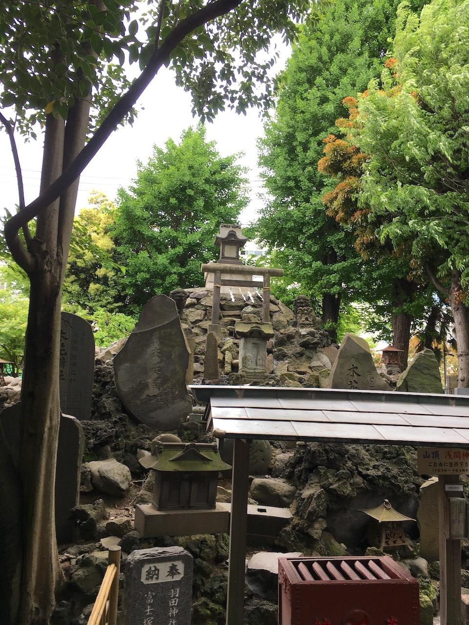 社務所と本殿の間に鳥居があり、その奥は富士塚になっていました。