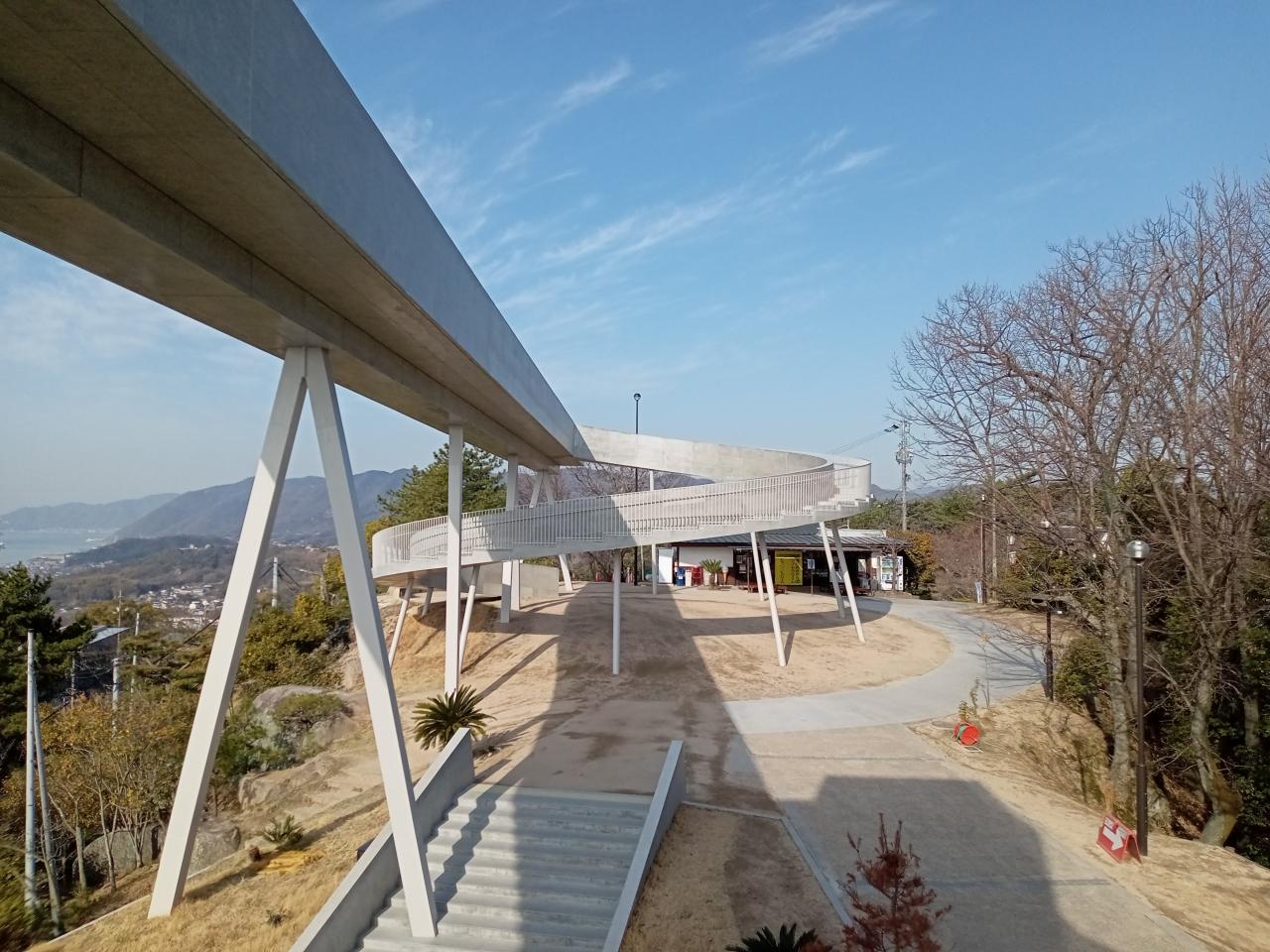 先ほどのループ状の展望台に上がります。右下の建物はGoogleマップによると尾道市立美術館のようです。