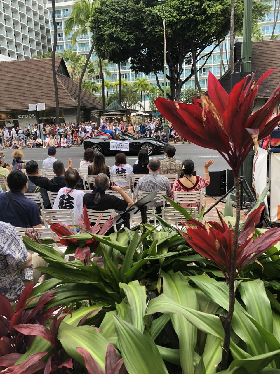 そのため、当初は渡航を諦め挨拶の動画を送ってありましたが、フェスティバル開催2週間ぐらい前になり、ハワイ州観光局とハレクラニホテルからサポートの申し出があり、急遽、行くことに。