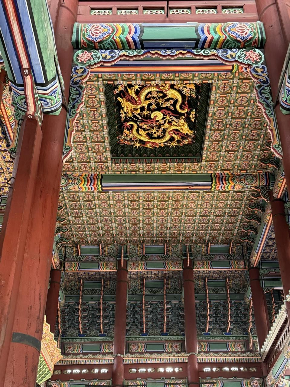 門の天井は極彩色。東西南北の方角を表す色があり、彩色していいのは身分の高い人の建物のみ。