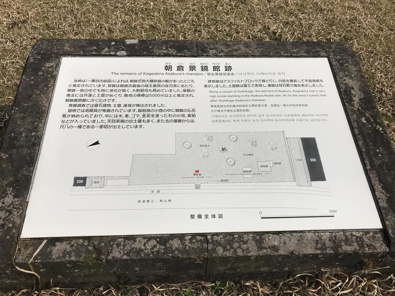 朝倉景鏡は、朝倉最後の当主5代目義景の従兄弟。朝倉館に次ぐ広い屋敷で南北には堀と土塁があった。